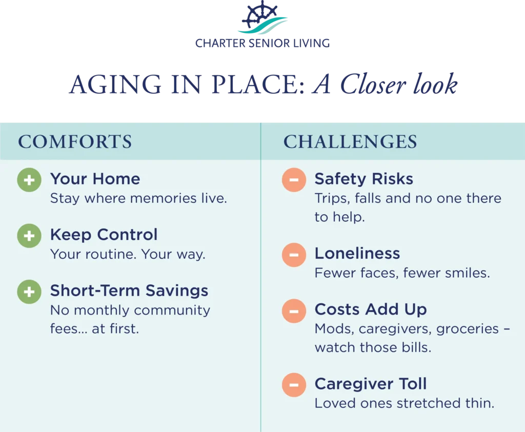 As needs change over time, aging in place (National Library of Medicine) can present challenges that affect safety, health, finances and overall quality of life. Before making a decision, it’s worth taking a closer look at the pros and cons so you and your family can plan with both the heart and the head.